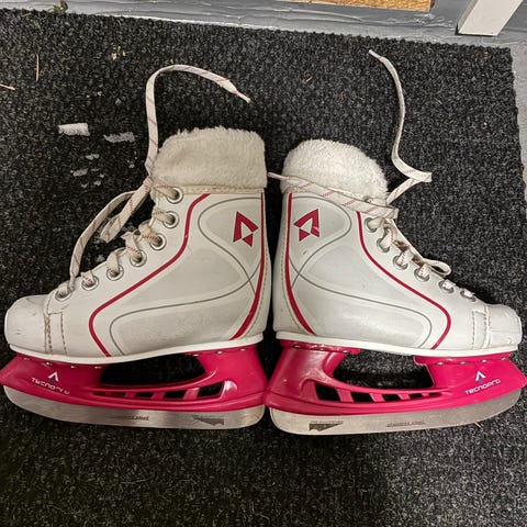 Lasten luistimet, koko 29. Väri valkoinen vaaleanpunaisilla yksityiskohdilla ja kuvioilla. Nauhakiinnitys. Soveltuvat muuhun luisteluun, esimerkiksi vapaa-ajan luisteluun jäällä. Terotettu, mutta olivatkin pienet. Muutama kolhu, mutta tosi hyvät silti.