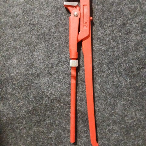 Putkityökalu, jossa on pitkä varsi ja oranssi-musta kahva. Työkalussa on säädettävä pää ja jousella varustettu varsi, joka soveltuu esimerkiksi putkien tai liitosten kiristämiseen ja löysäämiseen. Materiaali on metallia, ja kahvassa on muovinen tai kuminen pinnoite paremman otteen takaamiseksi.