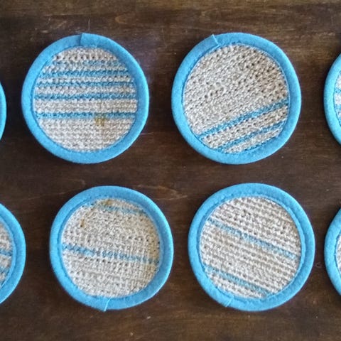 Itse tehdyt lasinaluset, joissa keskusta kangasta ja ympärille virkattu. Näitä ei ole koskaan käytetty, ovat siistit ja puhtaat. Virkattu osa ja kiinnitys tosi ohutta lankaa, joten eivät varmasti kestä kovin kovaa käyttöä. Ehkä käsityömateriaaliksi, koristeeksi tms? Nämä saat kaupan päälle, jos ostat jotain muuta minulta.