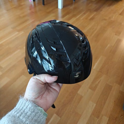 Punainen laskettelukypärä, kausaritarroja liimattu, saa pois :)
