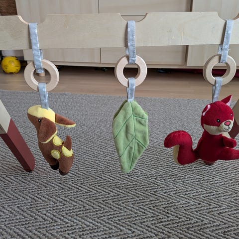 Lelukaaressa kolme roikkuvaa lelua, peili ja erilaista pehmoista materiaalia oleva pyöreä pinta. Voi siirrellä helposti haluamaansa paikkaan tai laittaa vaikkapa sitterin eteen.