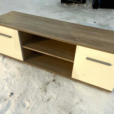 Tv-taso lasiovilla ja pyörillä. Pieni halkeama saranan kohdalla ovessa, muuten ehjä ja siisti.