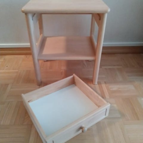 Kaksi täysipuista ruskeaa yöpöytää. Hieman naarmuja kannessa. Tukeva rakenne.