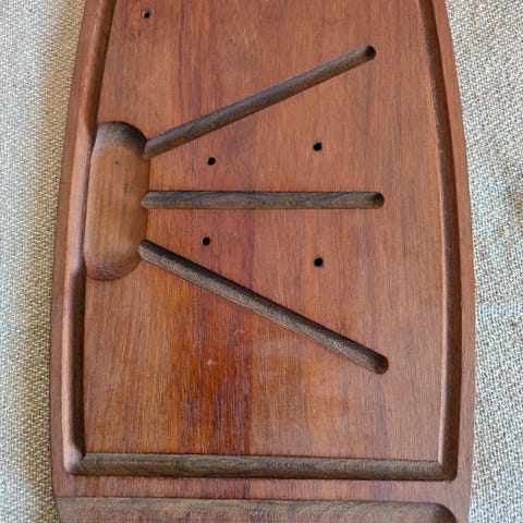 Erinomaisessa kunnossa oleva Hackman - Sorsakoski juustoveitsi Backman teak- leikkuulaudalla.