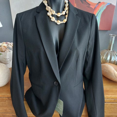 Musta, rento bleiseri, jota pari kertaa käytetty. Materiaali on miellyttävää polyester/viskoosia. Kangas on laskeutuvaa. Hihat rennot, niissä on pieni rypytys.