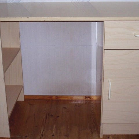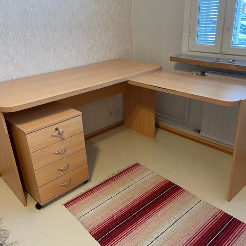 Kirjoituspöytä laatikostolla ja kaapilla, puunvärinen