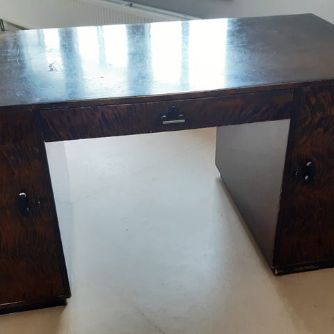 Puunvärinen kirjoituspöytä, jossa on tilava työtaso. Pöydän toisella sivulla on kaappi kahdella hyllytasolla ja ovella, toisella sivulla neljän laatikon laatikosto, joista ylin on lukittava. Sopii esimerkiksi työpöydäksi kotiin tai toimistoon ja tarjoaa runsaasti säilytystilaa papereille ja toimistotarvikkeille. Pöydän etureuna kuprulla.