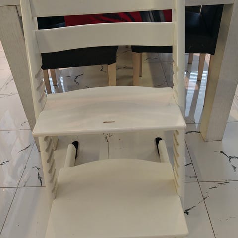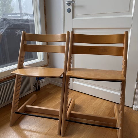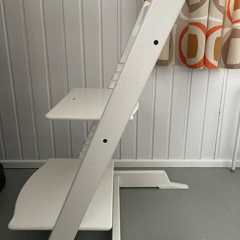Stokke Tripp Trapp syöttötuoli. Säädettävä istuin- ja jalkataso, jotka voidaan siirtää eri korkeuksille ja syvyyksille lapsen koon mukaan. Mukaan puinen etukaari. Siistikuntoinen, muutamia pieniä kolhuja.