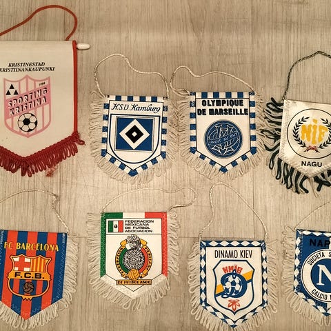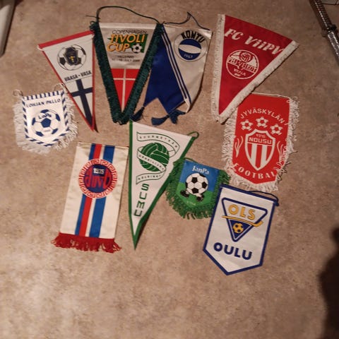 Jalkapalloseurojen viirakokoelma, jossa useita erikokoisia ja -muotoisia kangasviirejä eri seuroilta ja turnauksista. Viirit ovat monivärisiä ja niissä on seurojen logoja, vuosilukuja ja turnausten nimiä. Sopii esimerkiksi jalkapallokeräilyyn tai sisustuselementiksi urheiluaiheiseen tilaan.