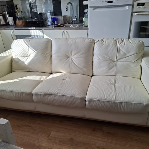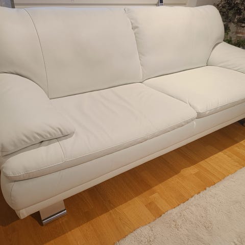 3+2 hengen valkoiset nahkasohvat. Mitat sohva 3: Lev. 200 syv. 90 kork 94. / Sohva 2: lev. 150 syv. 90 kork. 94. Istumakorkeus 48 kummassakin.