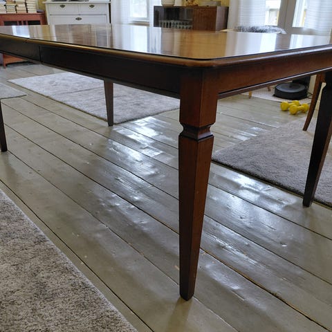 Annetaan mustaksi maalattu keittiönpöytä, josta maali lähtenyt useasta kohtaan. Hieman hutera, mutta kestää käyttöä.