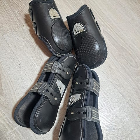 Myynnissä myös S-koon saman sarjan mustat jännesuojat ja takasuojat. Yht. Jännesuojat, takasuojat ja kantasuojat 150e.