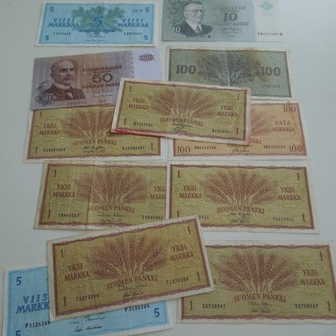 Vanhat setelit, rissiä ja taitetta, voi ostaa erikseen tai molemmat samalla. Vaasalainen 59€, 100 mk 1909 45€