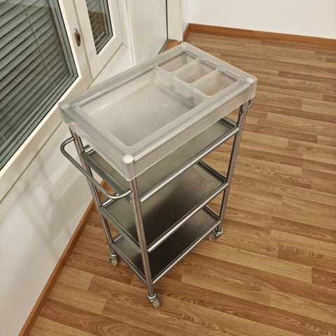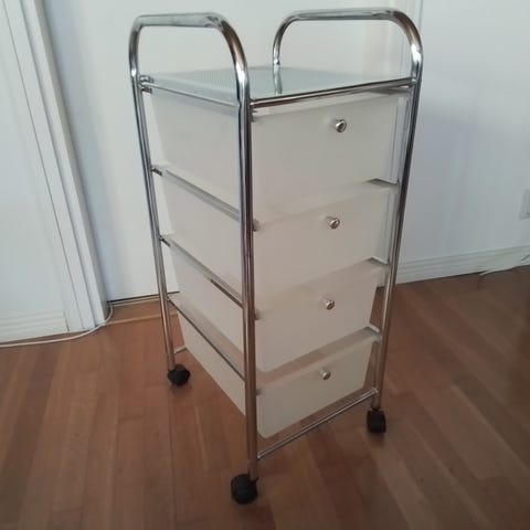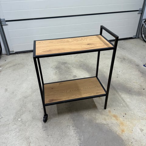 Kromattu tarjoilukärry, korkeus 60cm, leveys 51cm, syvyys 33cm, kahdella hyllyllä.