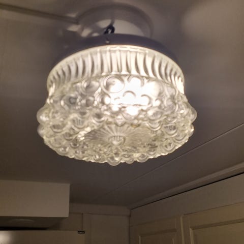 Kolmehaarainen, mid-century modern -kattovalaisin missä messinkirunko ja viehättävät lasikuvut. Korkeus 80 cm, leveys 60 cm. Sopii ruokapöydän ylle mutta myös olohuoneeseen. Täysin ehjä kauttaaltaan. Rungossa merkintä St (oletettavasti Sähkötarkastuslaitoksen hyväksyntä). Ajatonta eleganssia!