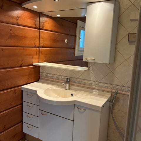 Annetaan valkoinen 120 cm allaskaapisto jossa 90 cm leveä pesuallas sekä Oraksen hana. Kaapisto ja allas on 50 cm syvä. Pesualtaan lasituksessa on ylivuotoaukon ympärillä hiusmurtumia. Ne on kuitenkin visuaalisia ja sormella ei tunne niitä.