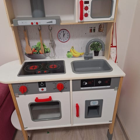 Puinen lasten leikkikeittiö, muovisia ja puisia keititiöleluja sekä nuken syöttötuoli. Keittiössä hiukan käytön jälkiä jotka näkyy kuvissa mutta kokonaisuutena hyväkuntoinen. Syöttötuoli korjattu (näkyy kuvasta)
