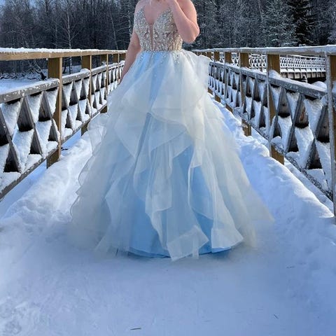 Zazabella vanhojentanssimekko, koko 34. Oranssi naisten mekko, materiaalina polyesteri. Mekossa on kapea yläosa ohuilla olkaimilla ja syväpääntie edessä. Selässä on nyörikiinnitys. Vyötäröllä kulkee koristeellinen strassivyö. Helma on monikerroksinen ja runsas, jossa on epäsymmetrisiä, kevyesti laskeutuvia kerroksia. Sopii ilta- ja juhlakäyttöön, kuten vanhojentansseihin, juhliin tai muihin tilaisuuksiin.