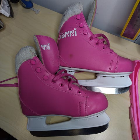 Useammalla lapsella käytössä olleet luistimet. Kokomerkintää ei näy, mutta pohjallinen on 19cm, joten olisiko nämä arviolta noin kokoa 29.