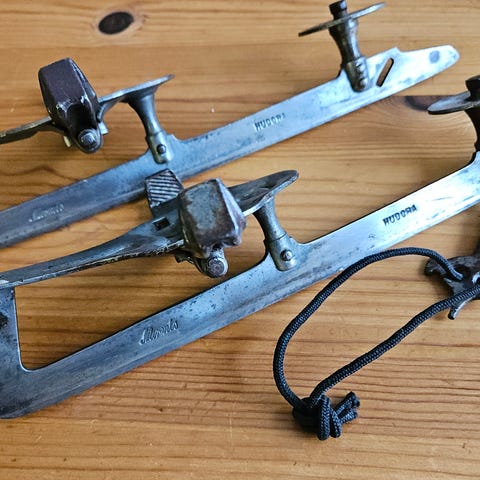 Karhu luistimet, koko 43. Luistimissa nahkainen päällinen mustan ja burgundin sävyissä sekä nauhakiinnitys ja lisäremmi nilkan tukemiseksi. Terä on kiinnitetty ruuveilla pohjaan.