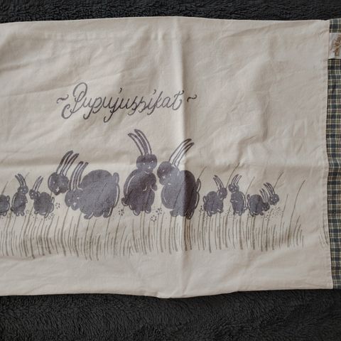 Vauvan tai lasten tyynyliina, jossa pupuja. Pahoittelut ryppyisyydestä. Mitat näkyy kuvissa, periaatteessa kokoa 60x40cm.
