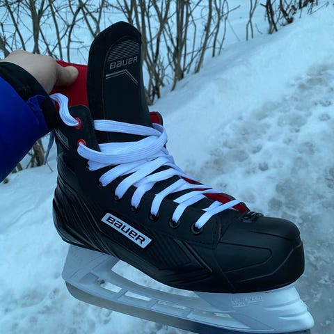 Tacla hokkarit, koko 43. Väri musta–valkoinen. Nauhakiinnitys ja perinteinen teräluistinrakenne. Soveltuvat yleiseen luisteluun ja harrastekäyttöön jäällä.