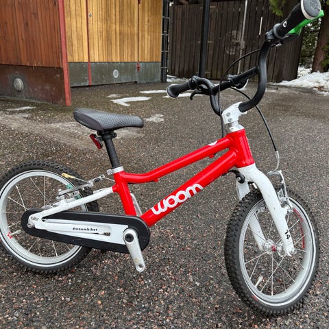 Woom 2 lasten polkupyörä, jossa 14" renkaat.