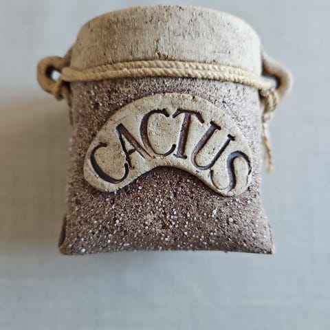 Korkea kaktus mustassa kulmikkaassa ruukussa. Korkeus yhteensä 210 cm, ruukun korkeus 100 cm. Istutusalue on vain ruukun yläosassa.