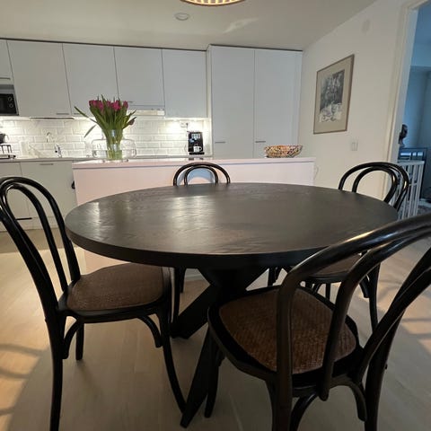 Hyväkuntoinen ja tukeva Veken Morgan pöytä. Pöytälevyn halkaisija 120cm. Viimeisissa kuvissa pöytälevyn päällä olevat jäljet, muuten kunnossa ei moitteita.