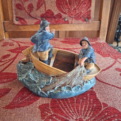 Haitaristi veneessä, vene maalattu. Muuten ehjä. Figuurin entistä historiaa en tiedä, ollut n.10 vuotta vitriinissä.