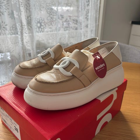 Wonders loafarit, koko 39. Mustat keinonahkakengät, joissa korotettu ja uritettu pohja. Päällinen sileää ja kevyesti kuvioitua keinonahkaa, pyöristetty kärki ja perinteinen loafarinauha päällä. Sisäpohja vaaleaa materiaalia. Sopivat arkikäyttöön ja siistimpään pukeutumiseen.