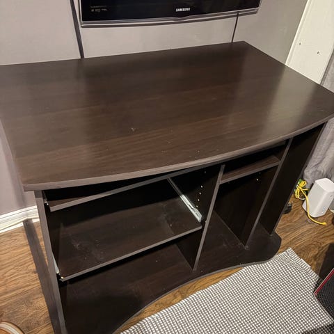 Ruskea lastulevyinen tietokonepöytä. Ostettu Sotkasta. Myydään tarpeettomana. Kun näppäimistötuki vedetty auki, syvyys n. 81 cm. Vain nouto.
