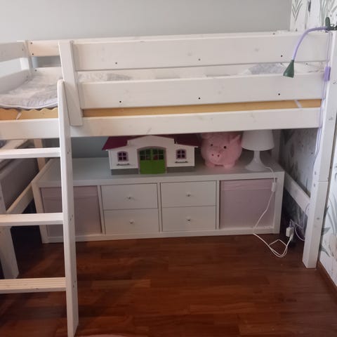 Tässä valkoinen puinen parvisänky. Hyvin palvellut. Muutama kolhu löytyy, mutta ne eivät vaikuta sängyn käyttöön.