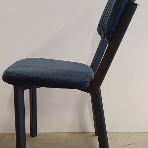Tuoli, jossa on sininen kangasverhoiltu istuin, musta metallirunko ja puinen selkänoja. Tuoli soveltuu esimerkiksi ruokapöydän, työpisteen tai neuvottelutilan istuimeksi. Selkeälinjainen muotoilu ja kevyt rakenne helpottavat sijoittelua eri tiloihin.