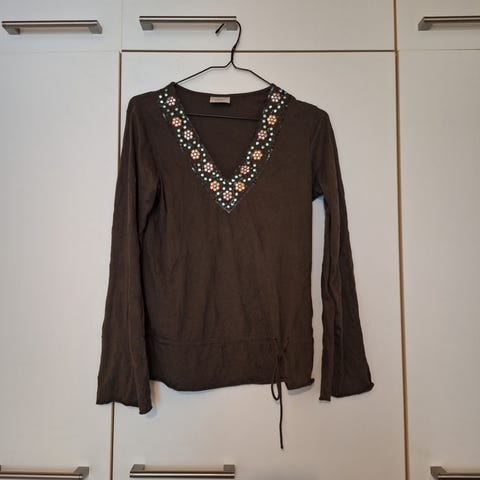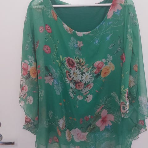 Bonprix Bodyflirt naisten paita, koko 40 (EUR 40/42). Vihreä väri, edessä perhoskuviointi. Materiaali 95 % viskoosia ja 5 % elastaania, kevyt ja laskeutuva trikookangas. Väljä, ponchomainen malli, lyhyet, leveät hihat ja pyöreä pääntie. Sopii arki- ja vapaa-ajan käyttöön. Hinta 1 euroa
