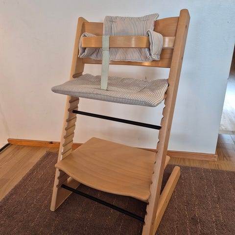 Hyväkuntoinen valkoinen Tripp Trapp syöttötuoli.