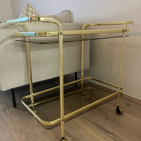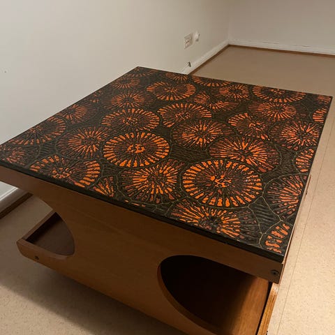 Kolme asentoo: kiinni, puoliks auki ja kokonaan auki. "Dinett", Saksa 1900-luvun puoliväli. Metallirunko, kaksi hyllytasoa. Leveys 67cm, syvyys 42cm, korkeus 77cm.