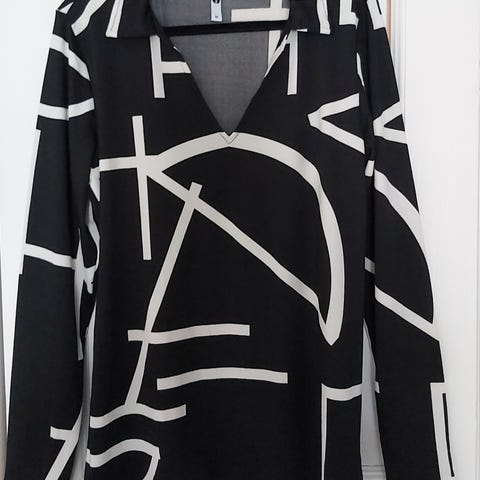 pusero, koko L. Materiaalina puuvilla. Puserossa on pitkät hihat ja ribbimäinen neulos. Väri on musta, jossa vaaleampi vaakaraita yläosassa ja hihoissa. Sopii arkipukeutumiseen ja kerrospukeutumiseen.
