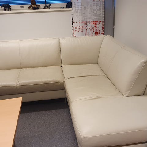 Myydään äärimmäisen mukava, mutta jo hieman elämää nähnyt valkoinen Neiser Riva kulmasohva tarpeettomana. Sohva on materiaaliltaan nahkaa.