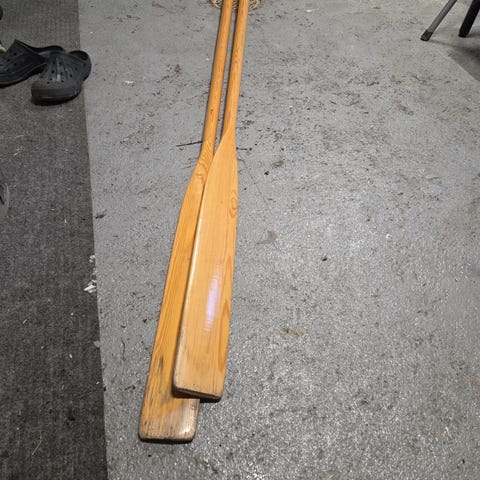 Valkoiseksi maalatut puiset airot. 2,70 m pitkä.