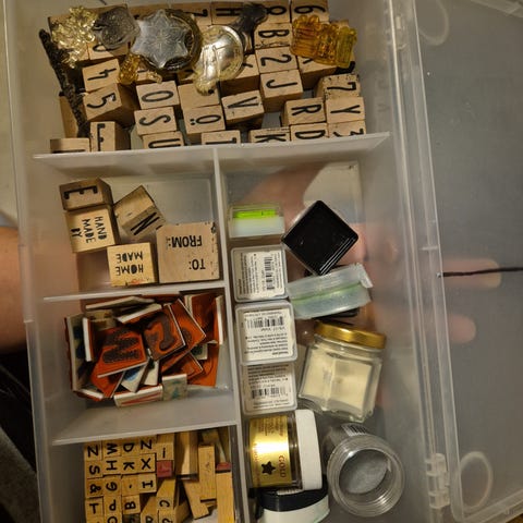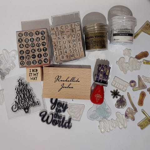 Myydään iso setti leimailitarvikkeita. Pääkuvassa koko setti, muissa kuvissa tarkempia kuvia. Osa musteista avattuja, en ole kokeillut toimivuutta. Kirkkaat leimat sisältää joulukortteihin sopivia tekstejä + onnea tekstin. Mukana yksi kirkas leimasinalusta, johon leimat saa kiinnitettyä. Glittereitä + alcohol ink applicator (avaamaton paketti). Suurinta osaa tarvikkeista ei ole ikinä käytetty. Toridiili tai nouto Kemin Tervaharjulta