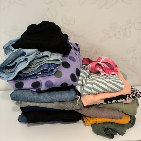 Teinin hylkäämät ehjät vaatteet, koko xs ja s, muutamat m-koon vaatteet. Paketissa farkkuja, t-paitoja, huopareita