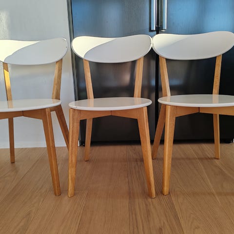 Jysk ruokapöydän tuolit, jossa musta muovinen istuinosa ja selkänoja sekä puujalat metallivahvikkeilla. 15€/kpl eli yhteensä 60€