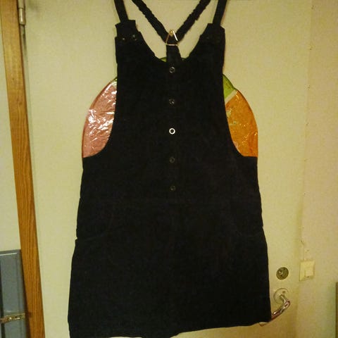 Tämä on H&M Divided -merkkinen musta vakosamettinen napitettava haalarimekko.