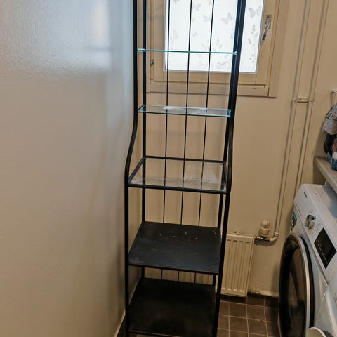 Ikean Rönsskär-hylly musta, metallia ja ylin hylly lasia.