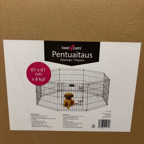 Best4pets metallinen pentuaitaus koostuu kahdeksasta 61 x 61 cm kokoisesta paneelista. Aitaus muodostaa suljetun alueen esimerkiksi koiranpennuille tai pienille lemmikeille. Metallirakenne on ritilämallinen, ja yhdessä paneeleista on ovi helpottamaan lemmikin käsittelyä ja kulkemista. Soveltuu käytettäväksi sisätiloissa tai sään salliessa myös ulkona tasaisella alustalla.