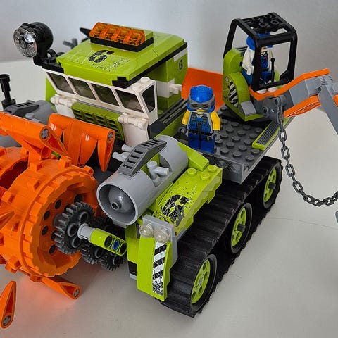 LEGO Power Miners rakennussarja, jossa on vihreä yhden hengen ajoneuvo suurilla oransseilla etupyörän terillä sekä kaksi minihahmoa. Settiin kuuluu sinikypäräinen Power Miners -hahmo sekä harmaa-violetti kivihirviö. Kuvissa näkyy myös alkuperäinen ohjekirja. Sarja sopii LEGO Power Miners -teemaan ja on yhteensopiva muiden LEGO-palikoiden kanssa.