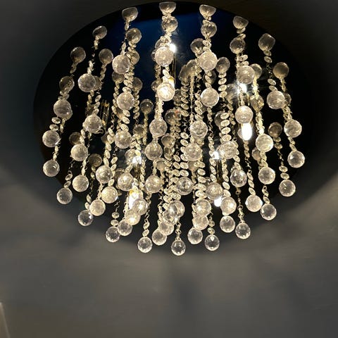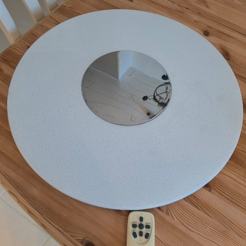 Mantra-merkkinen kauniisti kimaltava LED-plafondi. Halkaisija 59,5 cm, korkeus 14 cm. Kaukosäätimellä saa portaattomasti säädettyä kirkkautta ja värilämpötilaa. Vähällä käytöllä ollut, joten uskoisin käyttöikää (30 000 h) olevan runsaasti jäljellä. Uutena v. 2018 ovh oli 300 e luokkaa.