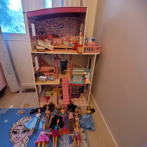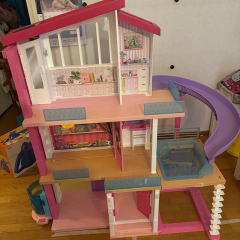 Barbie nukkekoti ja auto. Monikerroksinen muovinen nukkekoti, jossa useita huoneita ja parvekkeita sekä erillinen Barbie-auto. Sopii Barbie-nukeille ja vastaaville muotinukeille sisäleikkeihin. Hissi ei toimi narusta ja autotallin ovessa on halkeama, muuten siisti.