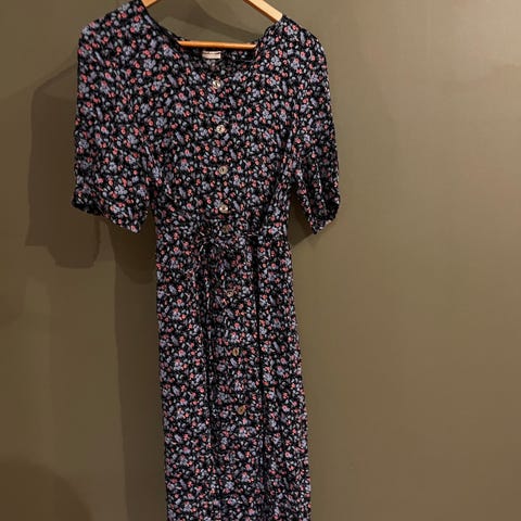 Ihana Old navy -mekko kokoa L. Naruvyö ja solmittavat narut kauluksessa. Edessä kauniita ommeltuja laskoksia, joita vaikea saada näkymään kuvissa. Pituus llla-helma n. 90 cm ja kai-kai n. 55 cm. Materiaalilappua ei ole, mutta viskoosin tapaista matskua on. Kangas ei jousta.